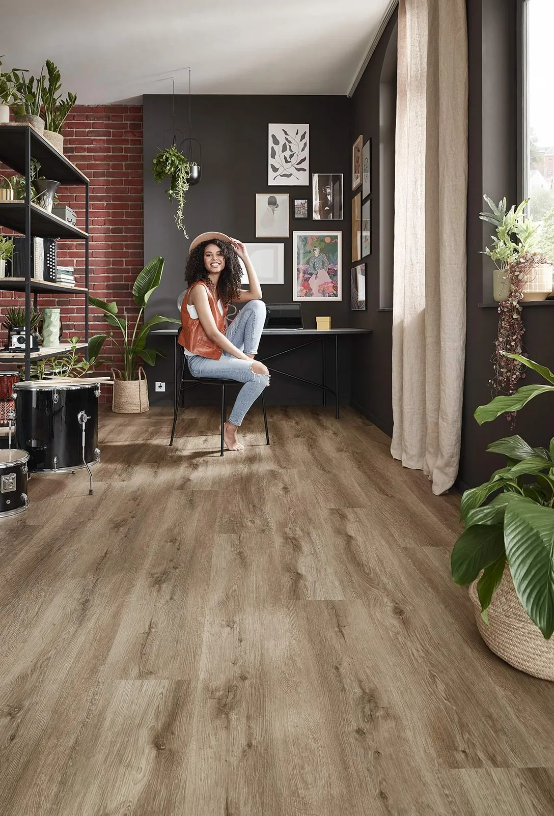 Design flooring da incollare con un'altezza di costruzione di soli 2 mm: ideale per ambienti umidi come cucine e bagni. Installazione resistente all'acqua e senza giunture su grandi superfici, per un aspetto complessivo armonioso senza giunti di dilatazione.